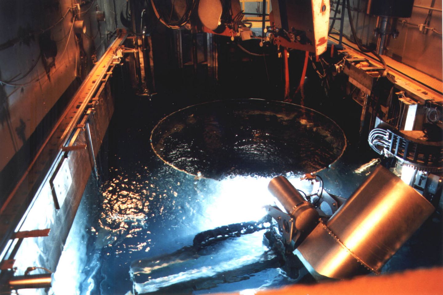 The wet disassembly facility was used for more heavily activated reactor internals. These were disassembled and packed with manipulators underwater in a special tank and then transported under a shielding bell to the designated container for interim storage.